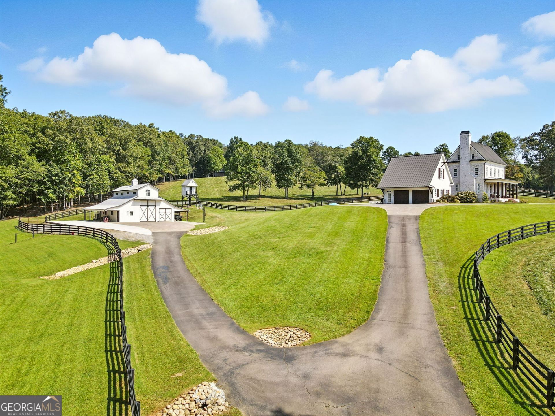 Prepare to be captivated by this extraordinary 18+ acre estate, a timeless Colonial Williamsburg-inspired property in sought-after Cherokee County. Back on the market as the sellers have solidified their relocation plans, this is a renewed opportunity for the next owner to enjoy a home that has been thoughtfully cared for over the years. Fully fenced and gated, the property offers exceptional versatility with room for equestrian use, hobby farming, recreation, or a private retreat with panoramic hilltop views. Two barns, subdivided pastures, and a PebbleTec pool enhance the grounds, while rolling hills and a creek-lined rear border create a serene setting. A cedar front porch captures long-range views, and a detached garage with breezeway and loft provides flexible space for guests, a studio, or storage. A circular drive completes the setting. The 6,500+ square foot residence blends refined craftsmanship with updated style. Freshly painted, it features 5 bedrooms, 5 full baths, and 1 half bath. Brazilian cherry floors span the main level. The formal dining room includes a fireplace, built-ins, and detailed millwork. The kitchen offers marble countertops, a large island with prep sink, farmhouse sink, custom cabinetry, and a butler's pantry, opening to a screened porch overlooking the pool and pastures. The main-level family room features a fireplace with built-ins and beadboard ceiling. The primary suite includes crown molding, dual-entry custom closet, and a marble bath with soaking tub, separate shower, and double vanity. A main-level laundry room adds convenience. Upstairs, a loft landing with built-ins and study nook leads to three ensuite bedrooms, including one with a clawfoot tub, plus a second laundry room. The third floor offers two flexible loft spaces for guests, office, or recreation. The terrace level includes a third fireplace, gym area, fifth bedroom suite, full bath, laundry closet, and ample storage. Outdoor living features a screened porch with fireplace overlooking the PebbleTec pool with ozone purification, fountain, and waterfall, along with covered patio space and under-deck system. The main barn includes a loft apartment with bedroom, full bath, kitchenette, separate utilities, and Wi-Fi-ideal for guests or extended living. Below are three oversized garage bays suitable for RVs or large vehicles, plus workshop space. Additional features include fenced pastures, a fitness area, irrigation, and a second barn originally designed for 5 stalls with tack room. An air-conditioned playhouse with electricity adds charm and flexibility. This rare property offers a unique combination of acreage, functionality, and refined living-ready for its next chapter.